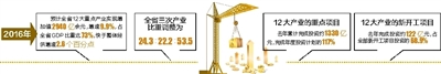 从重点项目投资情况看,2016年,12大产业重点项目累计完成投资约1330亿元,完成年度投资计划的117%,12大产业新开工项目完成投资约122亿元,占全部新开工项目投资的68.9%。