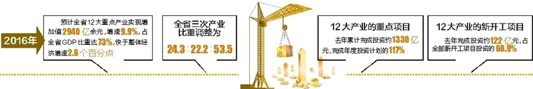 2016年,预计全省12个重点产业实现增加值2940亿余元,增速9.9%,占全省GDP比重达73%,快于整体经济增速2.6个百分点。其中互联网产业、现代金融服务业、高新技术教育文化体育产业、房地产业、 医疗健康产业、旅游产业、医药产业等7个产业增长速度超10%,快于GDP增长速度。在12个重点产业快速发展的推动下,全省产业结构进一步优化,三次产业比重调整为24.3:22.2:53.5,以现代服务业为主的第三产业比重进一步提升。
