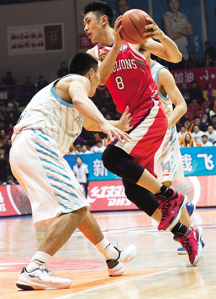 1月11日,在中国男子篮球职业联赛(CBA)第26轮比赛中,新疆队主场以135比109战胜广州队。图为广州队球员鞠明欣(中)带球突破。 新华社发