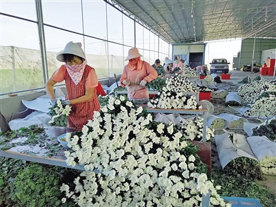 东方是我国最大的冬季菊花生产基地。去年9月,在政府的引导下,窑上村10户贫困户以劳力入股的形式,加入文兵的新科农民专业合作社种植白菊。政府投资进行基础设施建设,购买花苗、化肥,贫困户不用出一分钱,即可在收获后享受“五五”分红。此外,贫困户在基地干活,每个月还有2400元的工资。
