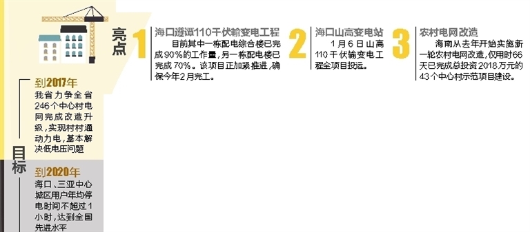 今年,海南将加快海缆联网二回工程建设,增强省间网络联系;加强220千伏“目字形”省级主网架,保障各类电源送出,满足负荷增长需求;优化海口、三亚、洋浦等重点城市网架,建设保底电网,不断提高电网抗灾能力;加快农村电网升级改造,建成安全可靠、结构合理、适度超前的城乡配电网。