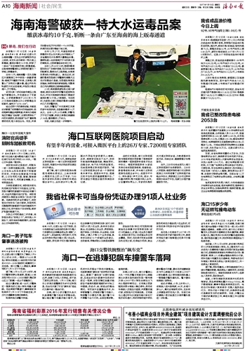 本报海口1月12日讯 (记者李磊 通讯员林小策 符伟潼)记者今天从海南海警一支队召开的新闻发布会上获悉,该支队成功破获一特大海上贩毒案,缴获冰毒约10千克,斩断了一条由广东至海南的海上贩毒通道。这是海南海警建队以来破获的最大一宗海上贩毒案件。