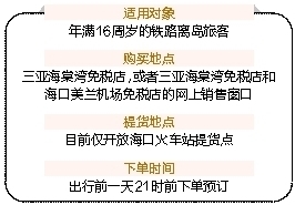 据悉,此次政策调整在前三次对购物金额、数量、品种调整基础上,对政策适用对象进行调整:年满16周岁的铁路离岛旅客凭个人离岛车票及有效身份证件,可在三亚海棠湾免税店或者通过三亚海棠湾免税店和海口美兰机场免税店的网上销售窗口购买免税商品。离岛时凭本人火车票、购物凭证、身份证件等在海口火车站提货点提取所购免税商品并携带离岛。