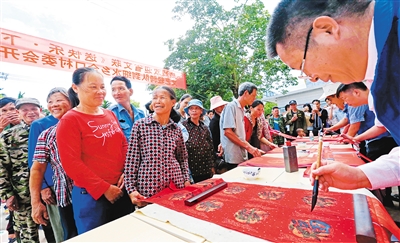近日,省文联组织的脱贫攻坚文艺轻骑队,深入多个市县的重点帮扶贫困村,为群众们送去形式多样的文化活动和文艺演出。图为1月12日,在白沙黎族自治县细水乡,文艺志愿者为贫困户泼墨书写春联。 本报记者 陈元才 通讯员 林呈 摄 (相关报道见A03版)