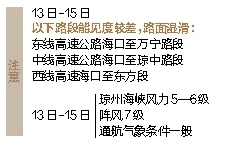 此外,省气象台也对未来3天全省主要交通路段的气象状况和琼州海峡通航气象条件进行了预报。13日—15日,海南岛东线高速公路海口至万宁路段、中线高速公路海口至琼中路段、西线高速海口至东方段,能见度较差,部分路段路面湿滑,对交通运输有一定影响,其余交通路段气象条件较好。13日—15日,琼州海峡风力5—6级、阵风7级,通航气象条件一般。