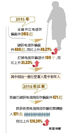 老年人一直是各种诈骗案件的“易发区”。数据显示,2015年,全省共立电信诈骗案件2413起,破获电信诈骗案件409起,同比上升49.27%,打掉电信诈骗团伙109个,同比上升31.33%,其中相当一部分受害人是中老年人。