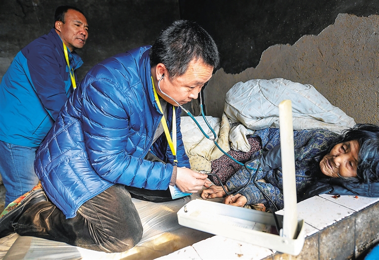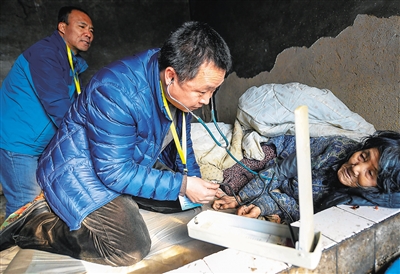 1月14日,志愿者在霸州市胜芳镇新村为卧病在床的特困村民量血压。 新春到来之际,成立于2014年的河北霸州“野火”志愿者协会筹集生活物资,为周边贫困家庭送去生活必需的米、面、油等,并为他们理发、做体检,在寒冷的冬日送去一份爱心。 新华社发
