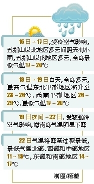 本报海口1月16日讯 (记者叶媛媛 通讯员袁迎蕾 翁小芳)“阴雨天气何时了?”这成了近日琼岛百姓最困扰的问题之一,记者今天上午从省气象台了解到,五指山以北地区的阴雨天气还将持续到17日。此外,预计19日起受较强冷空气影响,我省将再次出现明显降温和海上大风天气。