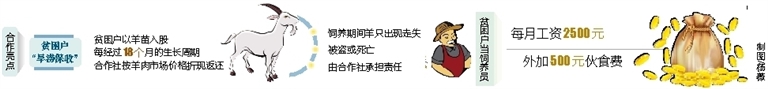 全镇133户贫困户与兴民东山羊养殖专业合作社签订5年合同,贫困户以政府发放的东山羊种苗入股,合作社提供技术和场地进行统一饲养。合作社和贫困户如何合作呢?举个例子:一位贫困户向合作社投入4只母羊种苗,投入时称重为40斤,5年期间,每经过18个月的生长周期,合作社就要按照当时的羊肉市场价格折现返还给贫困户,如果每斤羊肉价格为36元,则应返还5760元。饲养期间羊只出现走失、被盗或死亡,由合作社承担责任。此外,合作社养羊所需要的劳动力从贫困户中安排,饲养员每人每月2500元工资,外加500元伙食费。