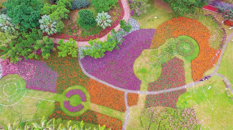高空鸟瞰海口市滨海公园三角梅花展靓丽景色。据了解,以“新花城 新海口”为主题的2017第二届海南国际旅游岛三角梅花展将于1月20日开展,展期至4月15日,将历时86天。本届花展开幕式设在日月广场,此外滨海公园以及正在建设中的玉龙泉海口国际三角梅花主题公园将与日月广场成为核心三大展区。