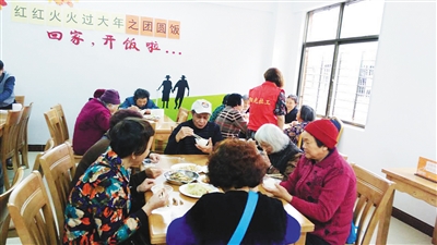 “阿姨们,开饭了,快来吃饭!”在社工们的招呼下,30多平方米的小餐厅很快热闹起来,28名老人团聚在这里,享受着一顿别样的新年团圆饭。