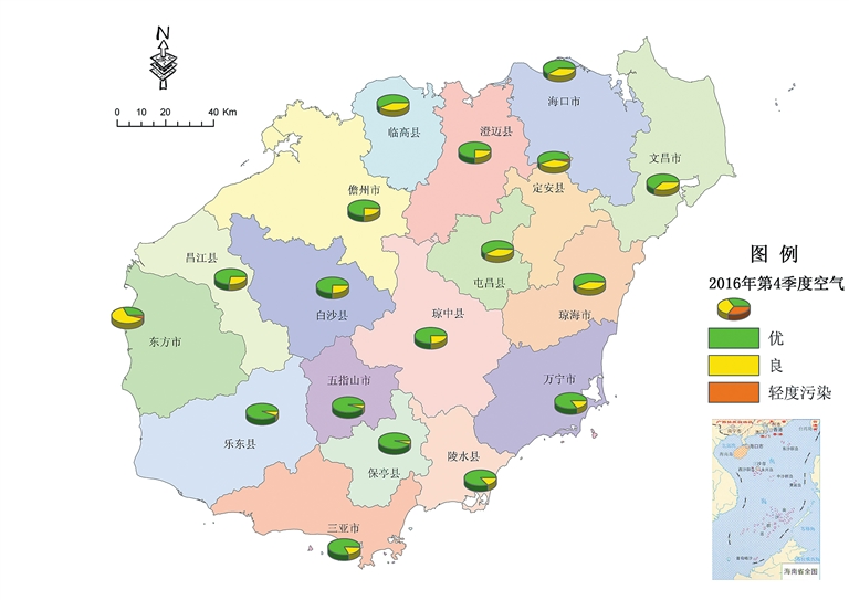 全省空气质量总体优良,优良天数比例为99.2%,其中优占71.9%、良占27.3%,轻度污染占0.8%,无中度污染和重度污染天。五指山、文昌、万宁、临高、白沙、昌江、乐东、陵水、保亭、琼中10个市县空气质量优良天数比例为100%;其余8个市县(三沙市除外)优良天数比例在95.3%~98.9%之间,其中,东方出现4天轻度污染(受臭氧影响),定安出现3天轻度污染(受臭氧影响),海口、三亚、儋州、琼海、屯昌、澄迈各出现1天轻度污染(受臭氧影响)。与2015年同期比较,全省空气质量优良天数比例上升3.4%,轻度污染天数比例下降3.3%,中度污染天数比例下降0.1%。