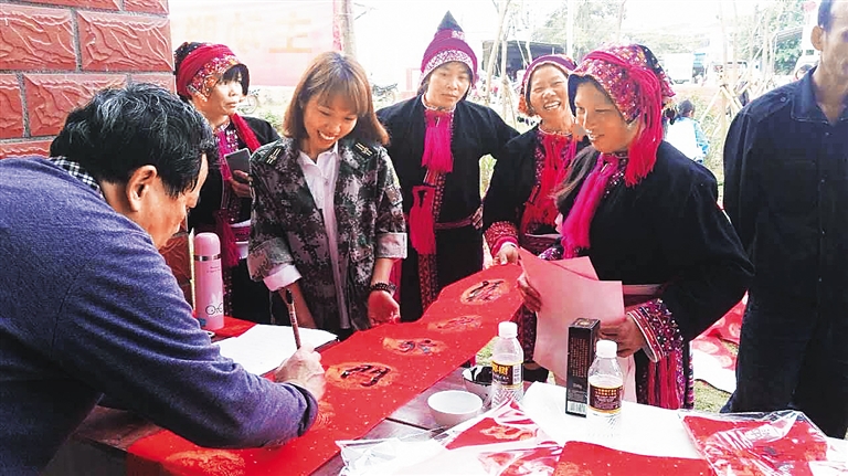 下午,不少村民早早换上了民族服饰,赶到了举办活动的青松乡政府。书画家们也没来得及收拾奔波的劳累,一下车就准备好笔墨砚台开始挥毫。“霸王岭下迎佳节,扶贫路上奔小康。”“一年四季行好运,八方财宝进家门”,书画家们在用春联为村民们送祝福的同时,也送上了脱贫致富的美好祝愿。