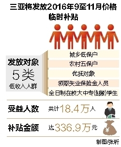 据悉,2016年9至11月我省居民消费价格指数(CPI)同比涨幅分别为3.2%、3.2%、3.6%,符合启动物价联动机制的条件。根据相关政策,三亚将向五类低收入人群发放2016年9-11月份价格临时补贴,补贴金额达336.9万元,符合此次发放价格临时补贴人员共计18.4万人。