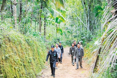 1月18日,在万宁三更罗镇,护林员和几名护林协管员正一起巡山。这些护林协管员都是周边村庄的贫困户。据悉,万宁市投入1000万元,吸收尖岭保护区、茄新保护区、上溪保护区、南林保护区等6个自然保护区周边村庄的883名贫困户当护林协管员,每名护林协管员每月劳务费1000元。本报记者 袁琛 摄