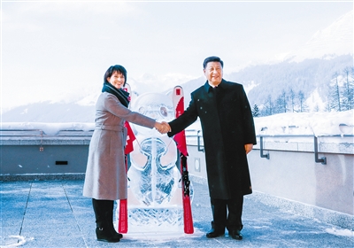 1月17日,国家主席习近平同瑞士联邦主席洛伊特哈德在达沃斯共同启动中瑞旅游年。两国元首在熊猫冰雕像和印有中瑞两国国旗及“中瑞旅游年”字样的滑雪板旁合影留念。 新华社记者 丁林 摄