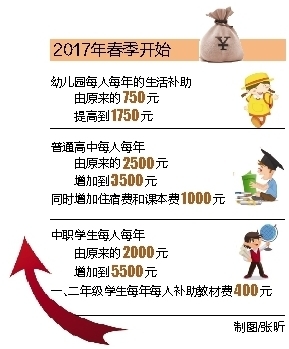 根据文件,2017年春季开始,幼儿园每人每年的生活补助由原来的750元提高到1750元,已获得贫困残疾人教育扶持(福彩公益金)项目补助资金的不再享受;普通高中每人每年由原来的2500元增加到3500元,同时增加住宿费和课本费1000元,已获得普通高中建档立卡家庭经济困难少数民族学生免住宿费和教材费的政策不再享受住宿费和教材费补助,已获得普通高中贫困残疾人教育扶持(福彩公益金)项目补助资金的不再补助生活费、住宿费和教材费;中职学生每人每年由原来的2000元增加到5500元,已获得“雨露计划”补助金及残疾部门组织实施的贫困残疾人教育扶持(福彩公益金)项目补助资金的不再享受,一、二年级学生每年每人补助教材费400元,已享受免教材费政策的不再享受。
