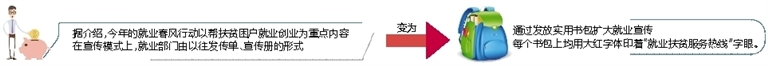 据介绍,今年的就业春风行动以帮扶贫困户就业创业为重点内容,在宣传模式上,就业部门一改以往发传单、宣传册的形式,通过发放实用书包扩大就业宣传,提高就业扶贫的宣传覆盖面,而每个书包上均用大红字体印着“就业扶贫服务热线”字眼。