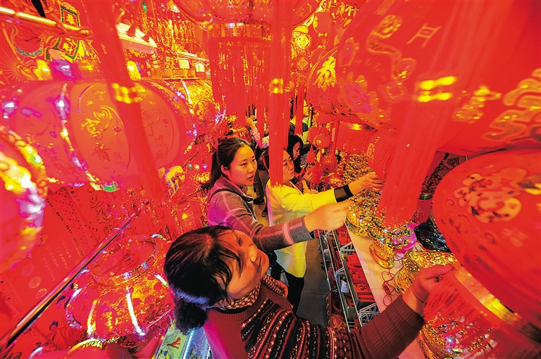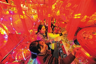 1月21日,海口市美兰区博爱南路,年货市场一片火红喜庆,众多市民前来置办灯笼、春联、中国结等年货,期望新年能有新气象。本报记者 袁琛 摄