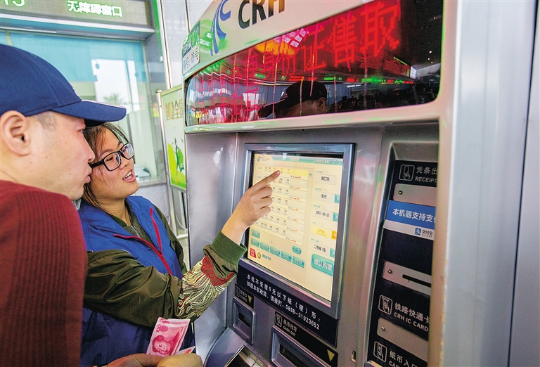 1月21日中午,环岛高铁海口东站售票厅,志愿者帮助旅客操作自动售票机,购买动车票。