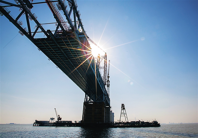 1月21日拍摄的完成合龙的沪通长江大桥天生港专用航道桥。 当日,世界最大跨径公铁两用钢拱桥——沪通长江大桥天生港专用航道桥顺利合龙,该航道桥采用主跨336米的刚性梁柔性拱桥结构,具有体量大、材料新、精度高、合龙准等工程特点。沪通大桥是我国沿海铁路大通道沪通铁路控制性工程,连接江苏省张家港市和南通市。