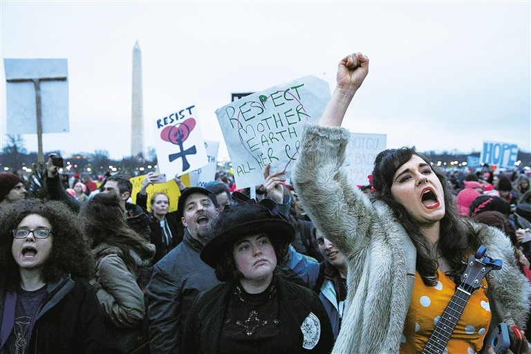1月21日,在美国华盛顿,人们参加游行活动。 在新任美国总统特朗普入主白宫不到24小时,美国华盛顿、纽约、芝加哥、洛杉矶等多地21日爆发大规模妇女大游行,上百万名以女性为主的游行民众用和平集会的方式要求在大选中屡屡对女性出言不逊的特朗普尊重女性权利、保护女性权益,要求新政府支持民权、反对歧视和停止族群分裂。 新华社/法新