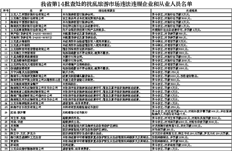 第14批公布的是2016年9月1日—2016年11月30日期间已结案并执行完毕的涉旅违法违规案件,共有35宗,涉旅企业25家(次),涉旅个人15人。其中涉及旅行社5家(次),导游2人(次);旅游酒店类7家(次);旅游购物类1家(次);旅游餐饮类5家(次);旅游交通类4宗;涉海旅游企业类2家(次);其他类1宗。此次公布的涉旅案件共依法吊销旅行社业务经营许可证1家;罚款35.26万元。