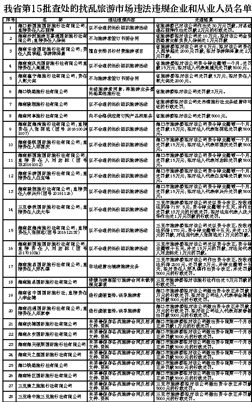 第15批公布的案件共28宗,其中8宗由省旅游委在整治期间立案查处,另外20宗是在国家、省、市三级联合执法检查期间立案拟作出行政处罚。
