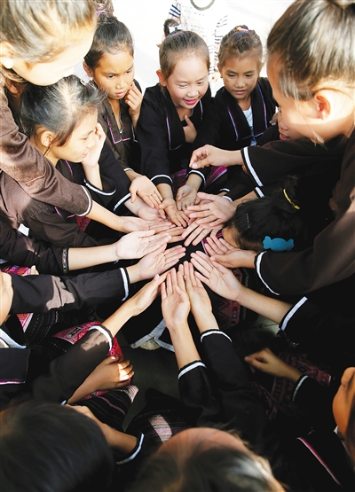 随后,玉龙村土生土长的娃娃乐队——“姑娘果”合唱队,演唱了《我们上学不要钱》、《赶鸟歌》两首美孚方言民歌。20多个穿着美孚黎族服饰的小女孩,一边唱歌,一边做出各种抒情的舞蹈手势,唱到节奏欢快的部分,整齐划一地击掌伴奏,引得村民阵阵鼓掌。