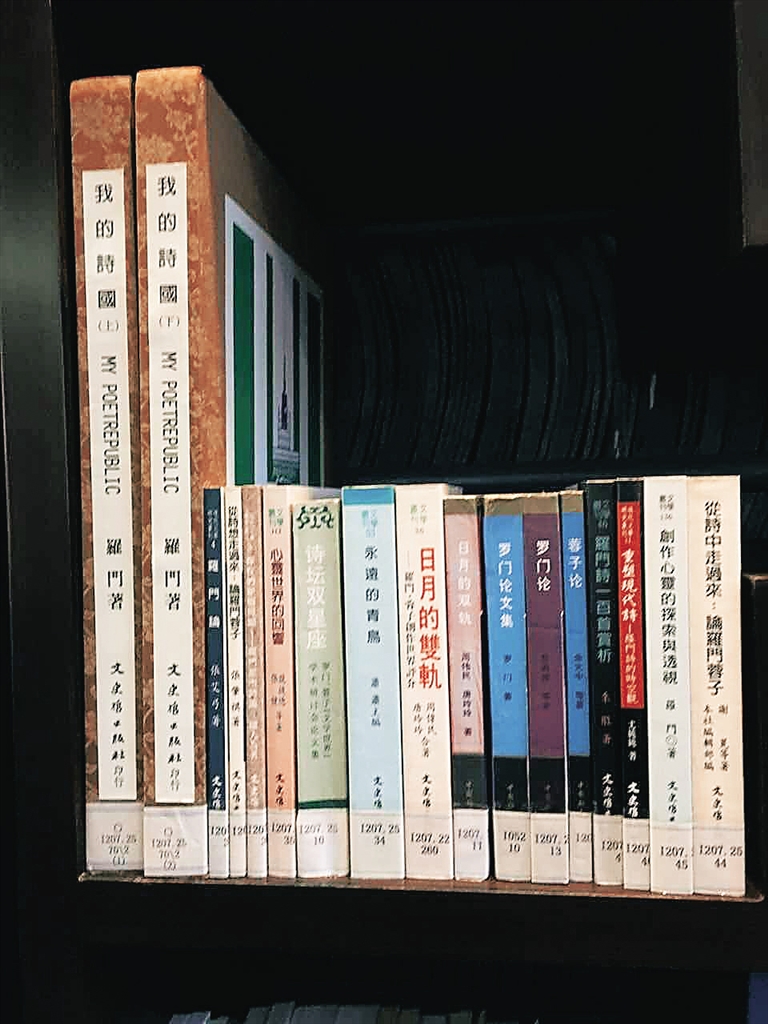每次与罗门交谈,他都会自豪地夸赞自己年轻时足球踢得特好,还不时地做一些危险的弹跳动作,完全不像一个80多岁的老者。1951年罗门不慎踢坏了腿脚,他不得不终止飞行生涯。1952年,罗门进入台湾“民航局”图书馆工作,得以阅读大量书刊,“诗的生命”再度复苏起来。次年的端午节诗会上,罗门邂逅了祖籍江苏扬州的女诗人王蓉芷(即蓉子)。1955年4月14日,他们在台北结为伉俪,婚礼上浪漫的诗朗诵,成为罗门津津乐道之事:我娶到了台湾诗坛第一把交椅!每当这时,江南女子蓉子只是在一旁微笑,任罗门吹牛去。