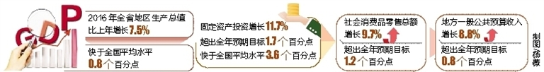 去年,我省供给侧结构性改革初显成效,亮点明显。一是经济保持中高速增长,主要指标增速快于全国,好于预期。全省地区生产总值继2013年突破3000亿关口后,时隔三年再突破4000亿关口。二是创新驱动积蓄新的增长动能,十二个重点产业发展势头良好,市场活力进一步释放。三是经济结构、投资结构、消费结构进一步优化。四是新发展理念得到很好落实。五是提质增效呈新局面,宏观效益、微观效益均有所提高。