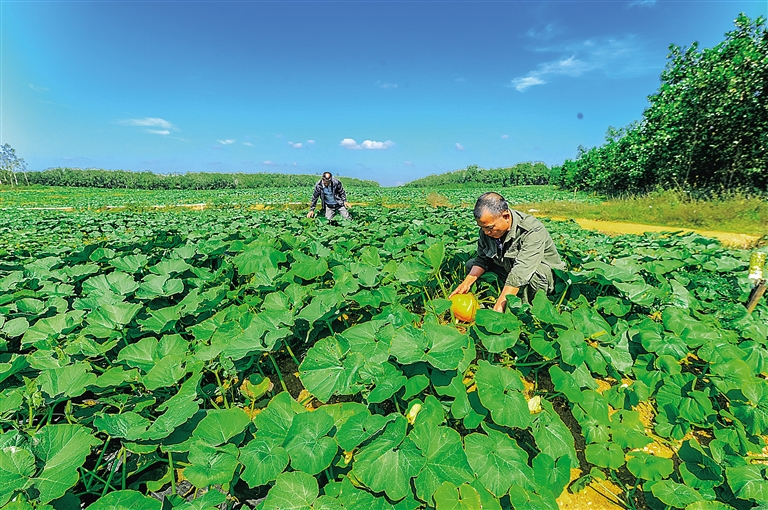 日前,海胶集团龙江分公司职工在管理橡胶小苗行间种植的南瓜。
