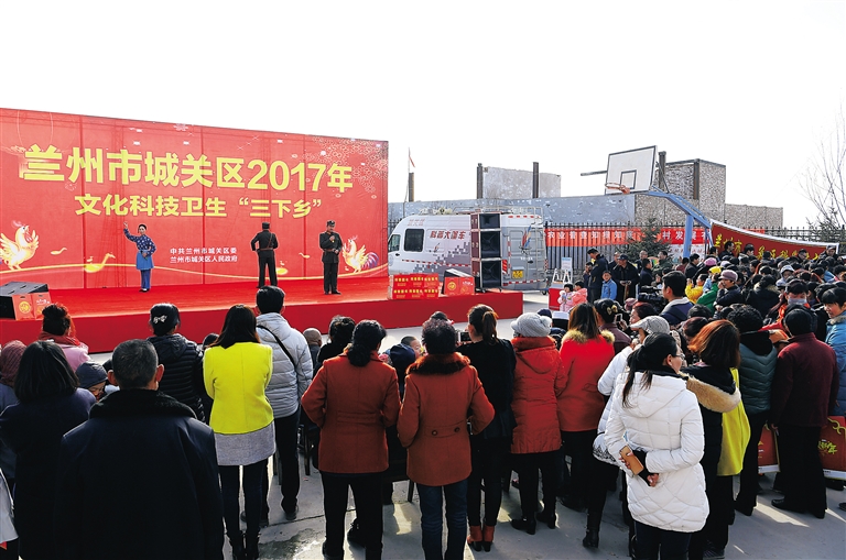 1月23日,兰州市伏龙坪街道二营村村民欣赏“三下乡”文艺演出。 当日,兰州市城关区伏龙坪街道二营村迎来当地政府部门组织的文化科技卫生“三下乡”活动。 新华社记者 范培珅 摄