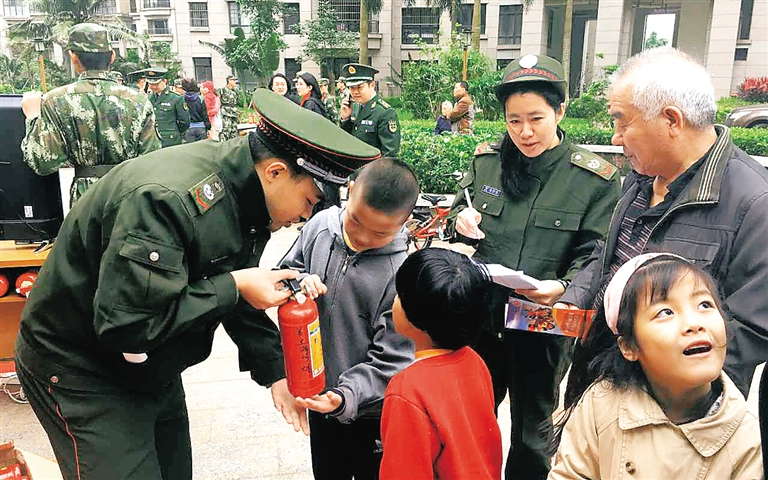 日前,海口美兰消防大队走进和风江岸小区,以群众喜闻乐见的方式普及消防知识和自救技能。本报记者 陈元才 通讯员 张苧琳 摄