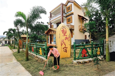 1月22日,在琼中黎族苗族自治县和平镇堑对村,贫困户刘春兰在民宿客房前打扫卫生。据介绍,堑对村民宿在政府的帮助下于去年建设起来,现在即将开始营业,刘春兰也成为该民宿企业的小股东之一。