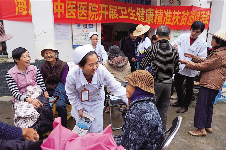 1月20日,海口市中医院医护人员来到海口市秀英区东山镇龙湾村,为当地困难群众开展卫生健康精准扶贫巡诊活动。天虽冷,现场却格外热闹,医生们热情地接诊每一位群众,为群众量血压、问病情、开处方,并耐心讲解常见病预防知识,让群众感受到了温暖。
