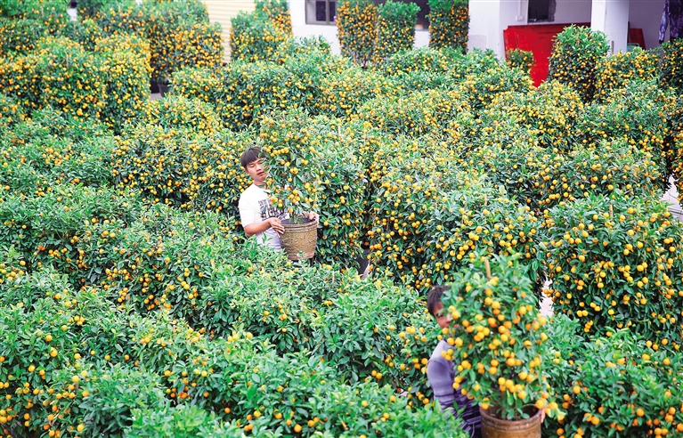 1月23日,海口琼山区红城湖延长线花卉市场,工人们在搬年桔。春节将至,不少椰城市民前来购买年桔,寓意来年吉祥富贵。 本报记者 张茂 摄
