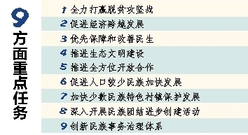 《规划》紧扣全面建成小康社会目标提出9方面重点任务(见图表)。同时,按照“十三五”时期国家支持少数民族和民族地区发展的建设重点,部署安排了少数民族特困地区和特困群体综合扶贫、民族特色优势产业振兴、少数民族特色村镇保护与发展等37个工程和项目。