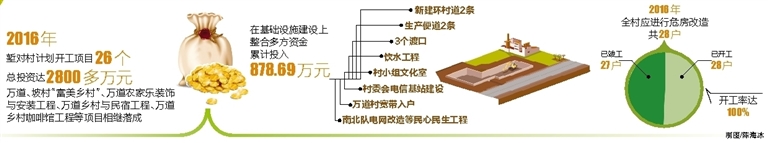 此外,在基础设施建设上,整合多方资金,累计投入878.69万元新建环村道2条、生产便道2条、3个渡口、饮水工程、村小组文化室、村委会电信基站建设、万道村宽带入户、南北队电网改造等民心民生工程。