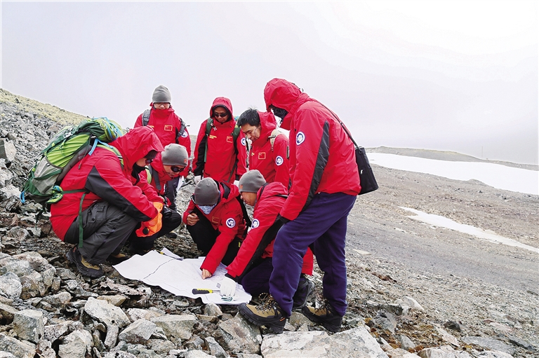 “海洋六号”陆地考察队在进行陆地地质取样和勘探。 春节期间,中国第33次南极科考“海洋六号”航次登陆考察队完成设计的路线地质考察任务,从中国南极长城站顺利返回科考船。这是“海洋六号”科考船科考队员第一次登上南极陆地开展地质踏勘考察。新华社记者 王攀 摄