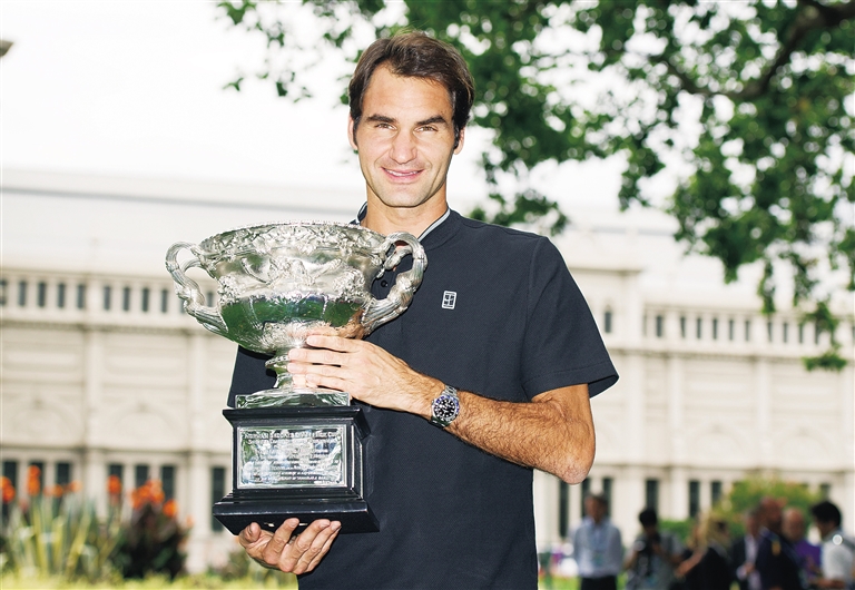 1月30日,2017年澳大利亚网球公开赛男单冠军瑞士选手费德勒在墨尔本拍摄写真。图为费德勒在卡顿公园的皇家展览馆前展示冠军奖杯。新华社发