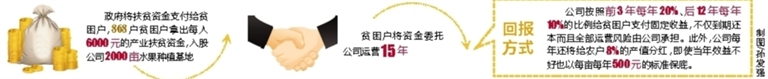 通过充分调研,该项目以“政府+贫困户+龙头企业”的精准扶贫模式推进——政府将扶贫资金支付给贫困户,贫困户将资金委托公司运营15年。回报方式是:公司按照前3年每年20%、后12年每年10%的比例给贫困户支付固定收益,不仅到期还本而且全部运营风险由公司承担。此外,公司每年还将给农户8%的产值分红,即使当年效益不好也以每亩每年500元的标准保底。