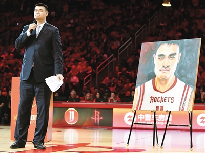 36岁的姚明发表了简短而感人肺腑的讲话。他说:“我希望人们能够看到悬挂在那里的球衣并记住其中的故事,不仅是关于我本人,而且是关于我的队友以及我的对手的故事。我们一起谱写了这个故事,就像其他的球衣为我们谱写了他们的故事一样。”