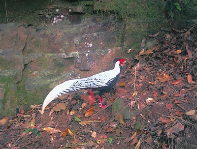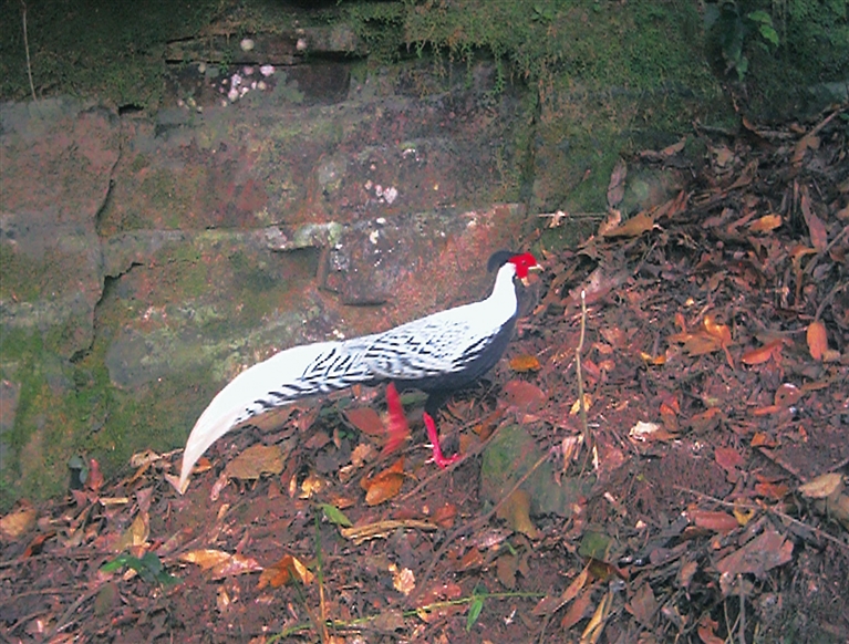 与原鸡相比,白鹇在这一方面算得上是“时尚达人”:它们眼裸出部分赤红,恰是最流行款的眼影;脚亦红色,鲜艳显眼;它们尾长,中央尾羽近纯白色,外侧尾羽具黑色波纹,从远处望去,就像披着白色长“斗蓬”,搭配着经典黑白色差的“底衣”;它们脖颈修长,体态挺拔,在林中疾走时,仿佛身边能刮起一阵风。