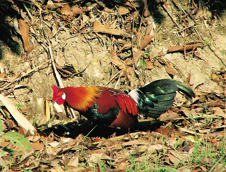 作为家鸡的“远祖”,原鸡与家鸡相似,只是体型偏瘦而长,在云南、广东、广西南部和海南都有分布。对于它们的“外形”,人们不会感到陌生,原鸡的雄鸟和雌鸟的“外形”有着明显的不同:雄鸟头具红色肉冠和肉垂,上体羽多红色,后颈和上背具有金红色矛状长羽,尾黑且泛着绿色金属光泽;雌鸟上体大都黑褐色,上背黄色具黑纹,胸部呈棕色。