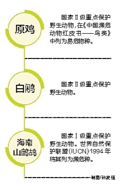海南从东到西、从北到南以及中部的市县,都有原鸡分布的记录,霸王岭、吊罗山、鹦哥岭、尖峰岭等热带雨林区也是它们重要的栖息地。在海南多地,原鸡被称作“山鸡”,甚至有人声称自己有“山鸡”出售,肉味鲜美,但也有人说“现在已经没有正宗的啦”。