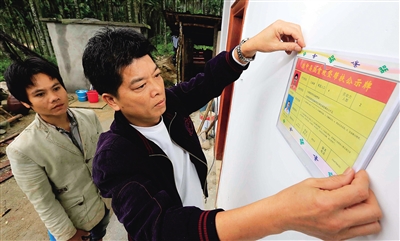 近日,在琼中黎族苗族自治县红毛镇金屏村,扶贫工作人员在贫困户门前粘贴《脱贫攻坚帮扶公示牌》,该公示牌上记录着贫困户家庭的基本信息,以及致贫原因、帮扶单位、帮扶措施、帮扶目标等内容,让村民对贫困户的基本情况一目了然,也激励着贫困户努力朝着脱贫目标前进,早日脱贫。