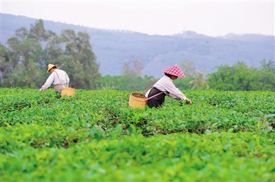 近日,海南农垦白沙绿茶生产基地,农户在茶园里采茶。“白沙绿茶”是全国每年最早上市的春茶,比内地的产茶区提早两个多月。