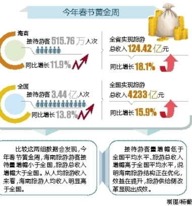 比较这两组数据会发现,今年春节黄金周,海南旅游游客接待量增幅小于全国,旅游总收入增幅大于全国。从人均旅游收入来看,海南旅游人均收入明显高于全国。