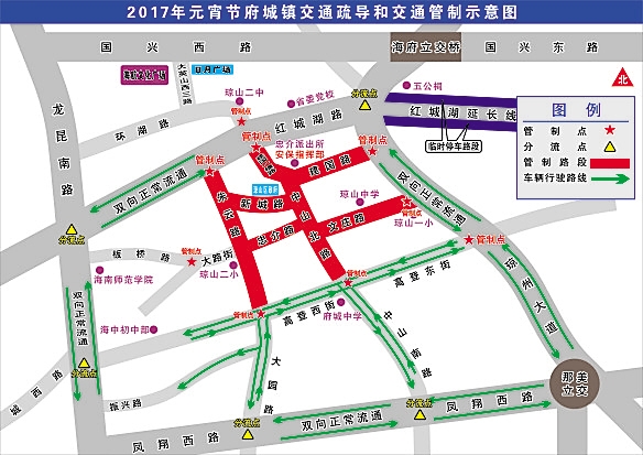 管制路段:琼州大道(不含)以西、红城湖路(含)以南、高登街(不含)以北、朱云路(含)以东的区域,即府城镇中心区域各路段